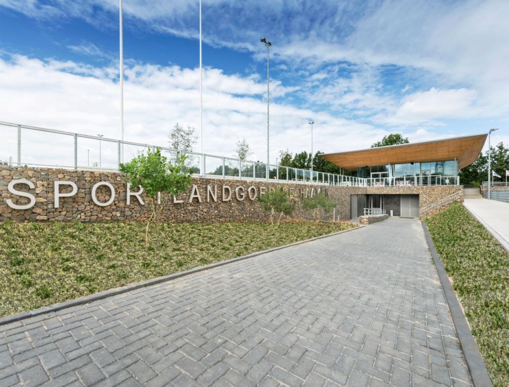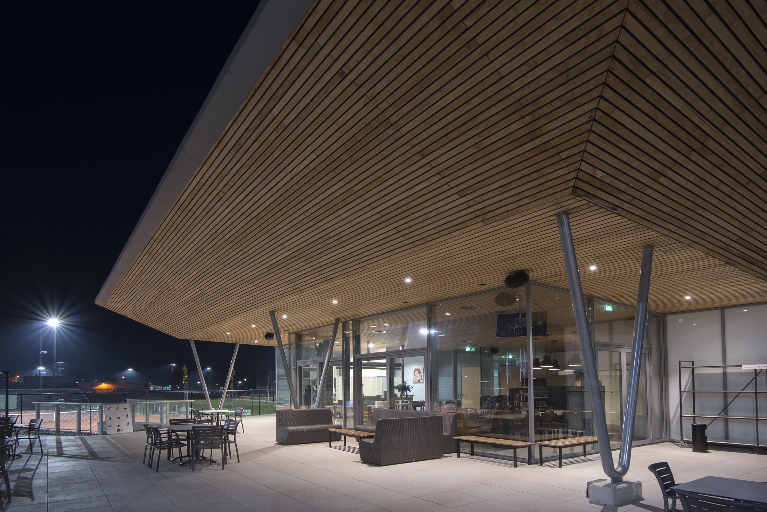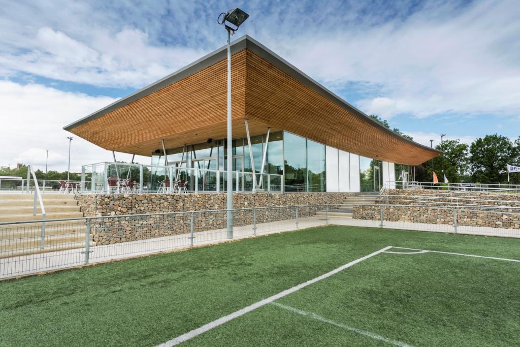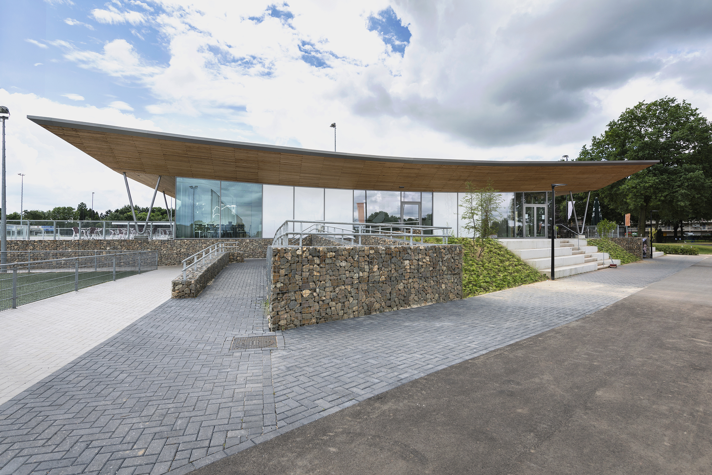 Vanuit de kantine is er direct zicht op de sportvelden, dit resulteert in een open en transparante setting. De terrassen bevinden zich aan de randen van het beschikbare bouwvlak en volgen de aanwezige contouren.