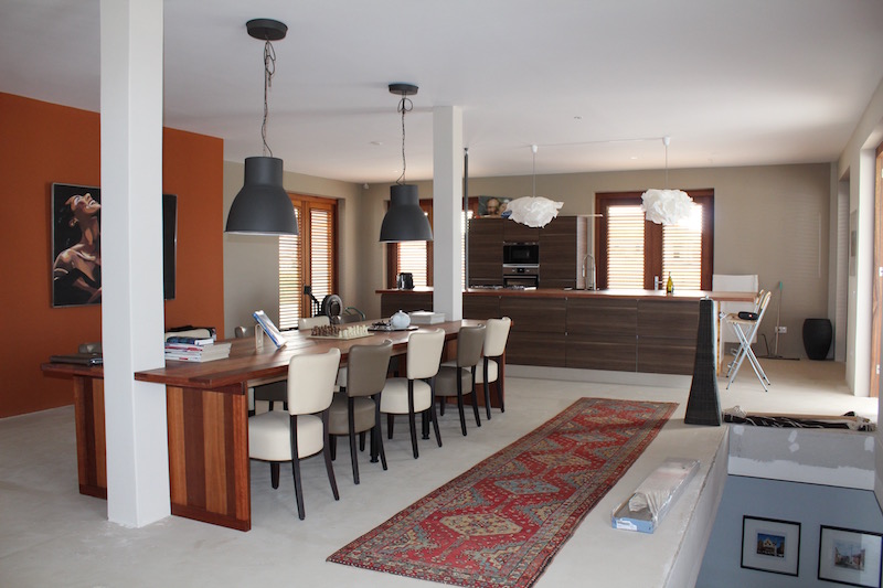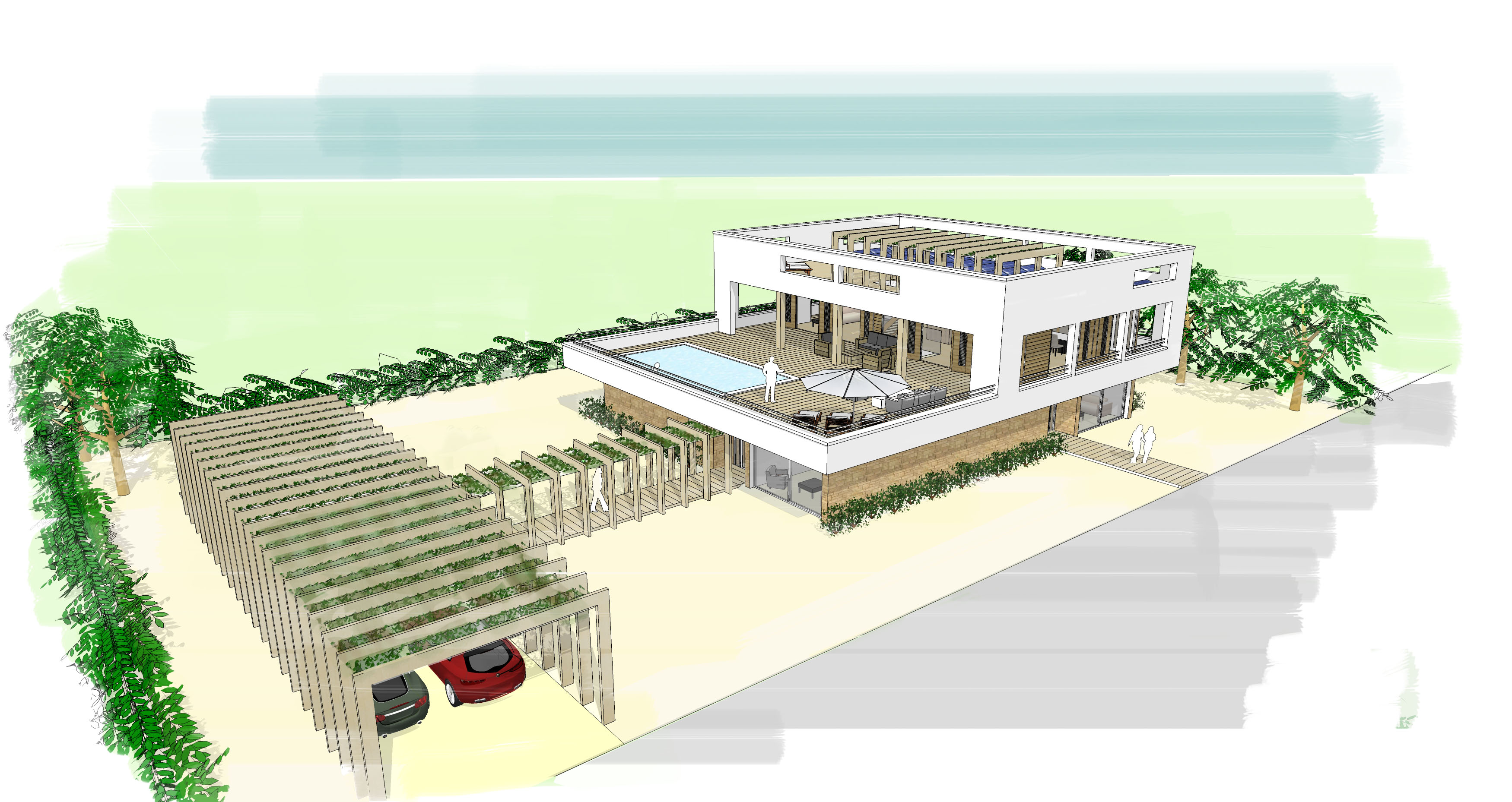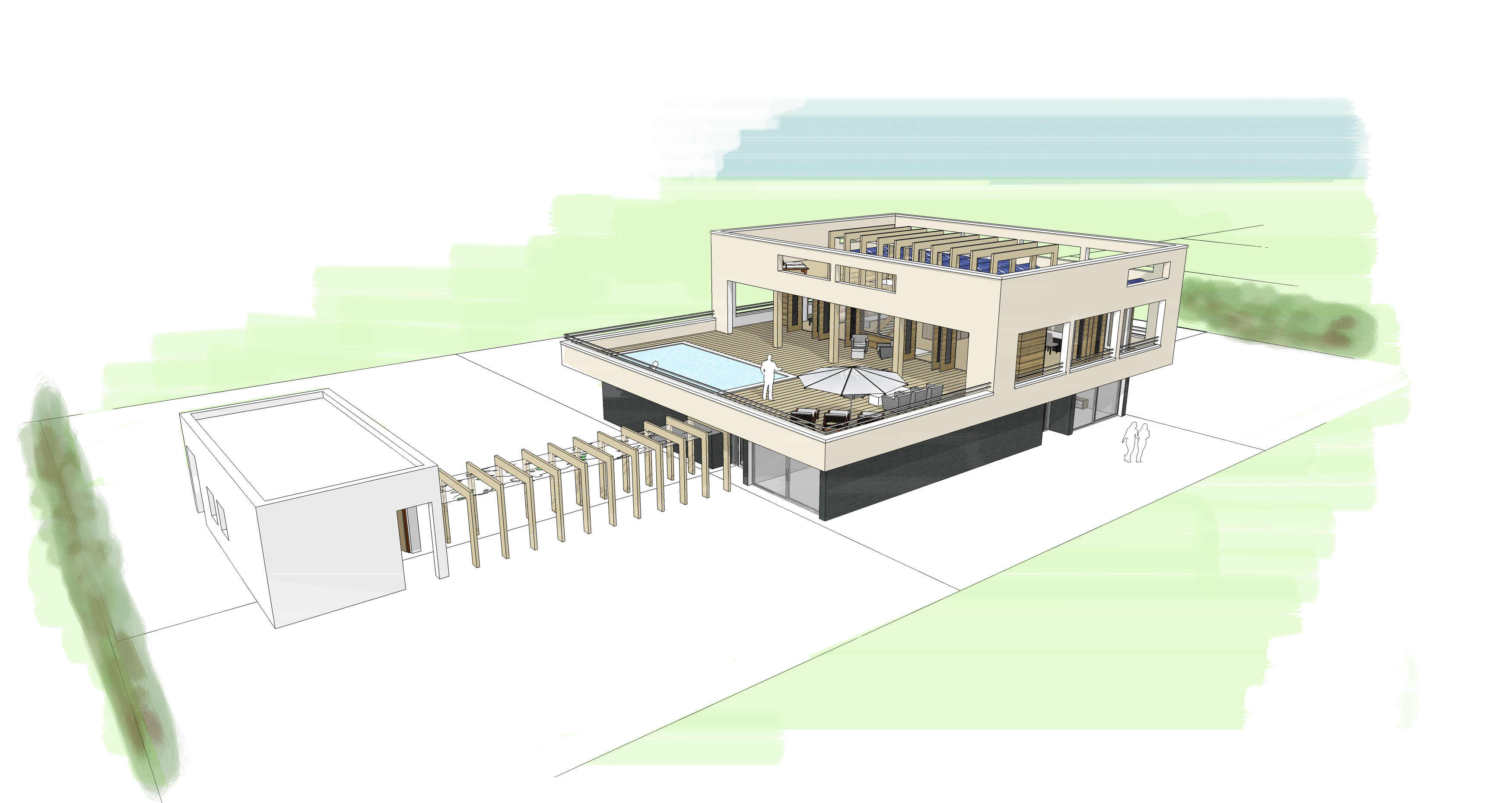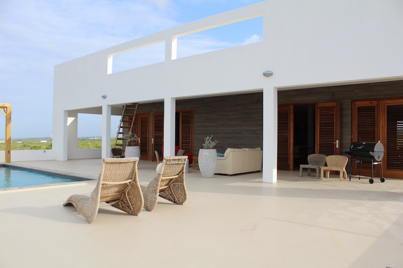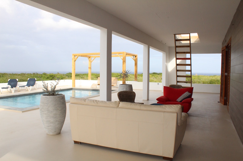 Villa met zeezicht in Grote Berg op Curacao. Op een prachtige plek op Grote Berg staat deze schitterende, moderne villa met prachtig uitzicht op zee en de wijk. U komt de villa binnen op de begane grond, er zijn 4 ingangen met daarnaast shutters die zorgen dat de wind goed door het huis heen komt. Op de begane grond bevinden zich de 4 slaapkamers met elk een eigen badkamer. Hier is ook een bergruimte en de techniekruimte voor het zwembad. In de royale centrale hal is de trap naar de eerste verdieping. Op de eerste verdieping is de ruime woonkamer met een fraaie open keuken met kookeiland en een eettafel voor 10 personen. Via openslaande deuren met shutters komt u op het overdekte terras dat een spectaculair uitzicht heeft over de zee en naar het vliegveld. Hier bevindt zich ook het zwembad van 8m x 4m en een groot terras. Op de tweede verdieping is het dakterras gesitueerd met nog meer fantastisch uitzicht!